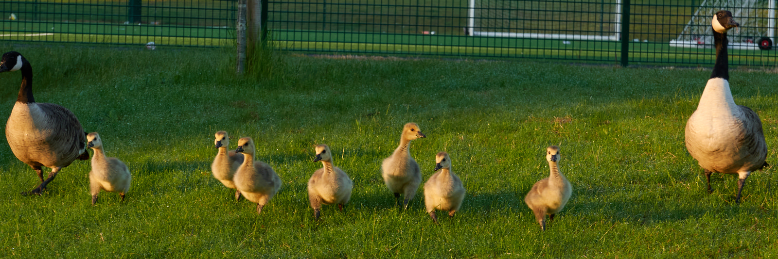 This landscape photograph shows a family of geese advancing across a grassy field in the early morning during the spring season. The adult geese are positioned on either side of a group of goslings, with all birds illuminated by the low, warm sunlight typical of morning hours. In the background, there is a fenced sports area with goalposts and artificial turf visible, indicating a suburban or park setting. The geese are spaced out and moving as a group, expressing typical family behavior in a natural outdoor environment.