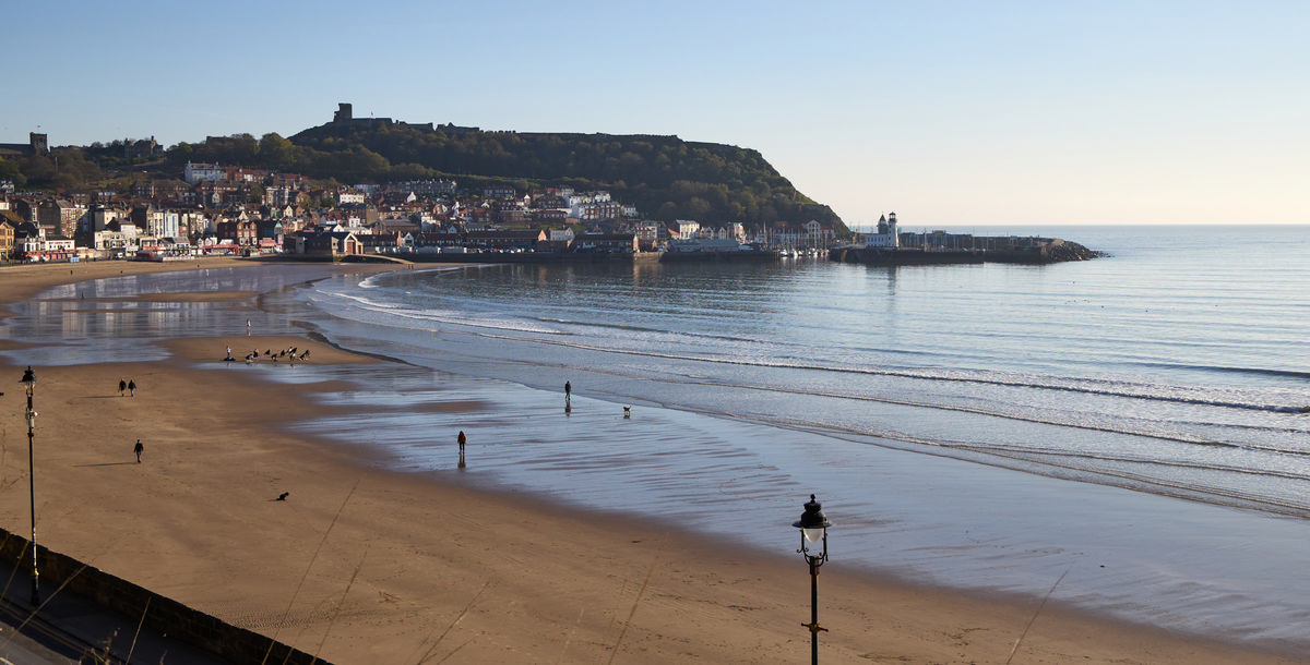 This landscape photograph captures Scarborough beach in Yorkshire during a calm spring morning. The soft sunlight illuminates the sandy shoreline, creating gentle reflections on the wet sand as small waves lap at the edge. In the background, Scarborough Castle is prominently perched atop the hill, overlooking the seaside town and adding a historical element to the scene. The town's buildings cluster along the waterfront, leading towards the harbour where the gentle sea meets the sky. The image showcases both the natural beauty of the beach and the iconic castle, perfectly encapsulating the coastal charm of Scarborough in Yorkshire.
