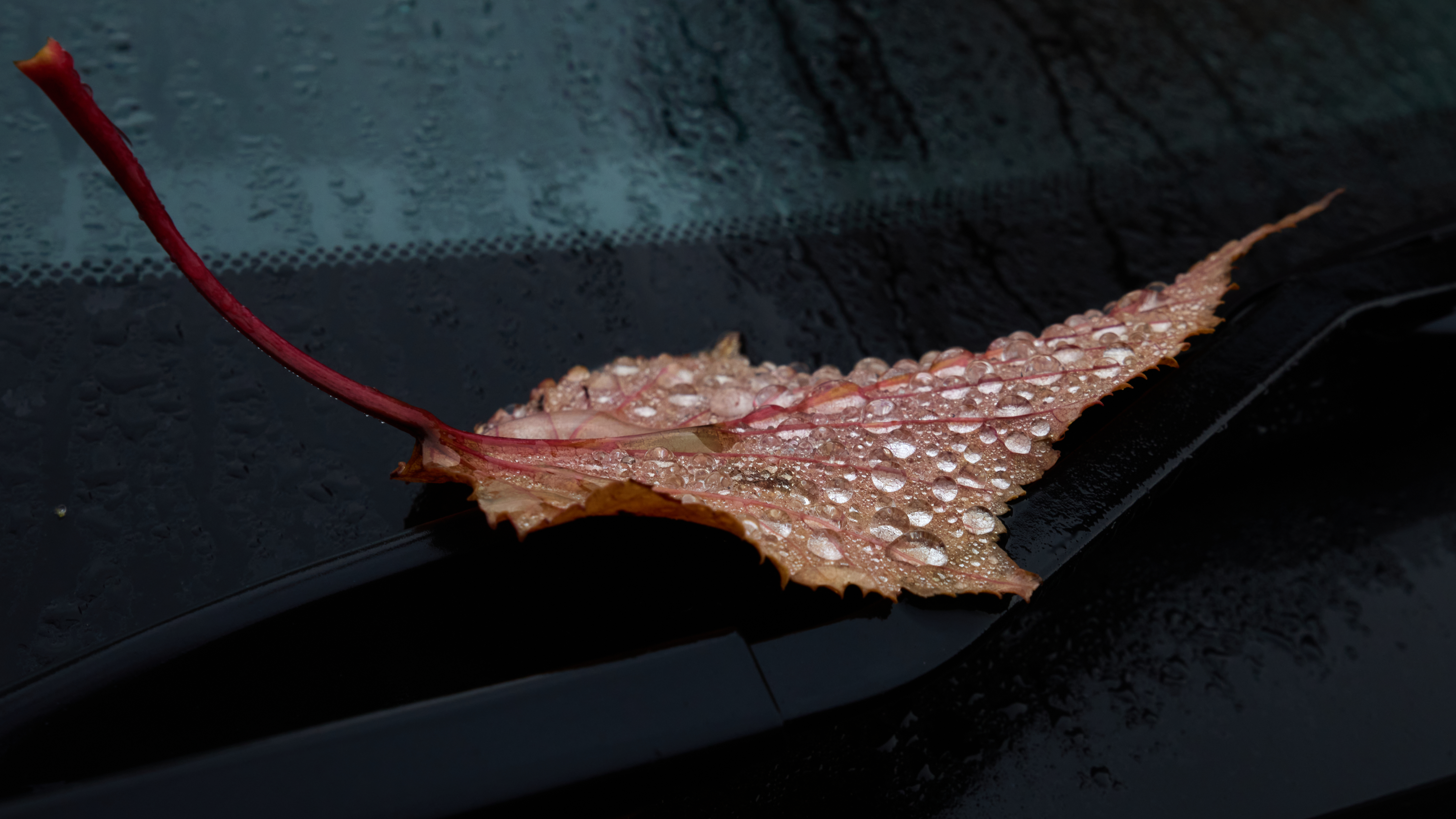 This is a still life photograph taken on an autumn morning, featuring a single leaf covered in water droplets resting on the black surface of a car windshield and wiper. The leaf displays autumnal colors and its surface is dotted with clear droplets of water, suggesting recent rainfall or dew. The background is composed of the misted glass of the windshield, which further emphasizes the cool, moist atmosphere typical of early autumn mornings.