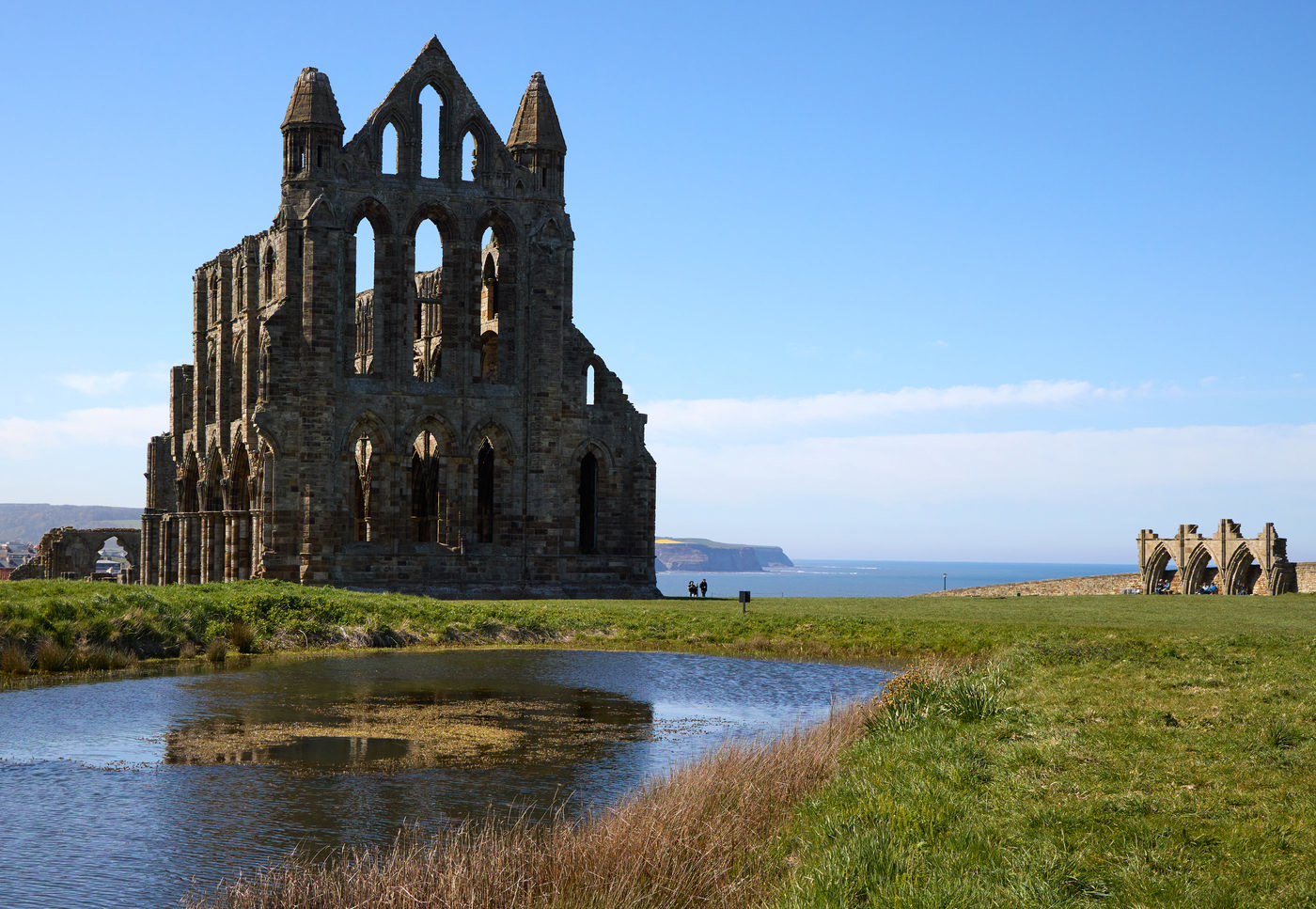 This landscape photograph captures Whitby Abbey, a historic church ruin located in Whitby, Yorkshire, as seen from the south east. The abbey stands prominently against a bright blue sky, reflecting in a small pond in the foreground. Taken in the early afternoon during spring, the image highlights the dramatic Gothic architecture of Whitby Abbey, with the North Sea and the coastal cliffs of Yorkshire visible in the background. The clarity of the scene and the fresh greenery suggest a mild and pleasant spring day, showcasing both the cultural heritage of Whitby and the scenic beauty of Yorkshire.