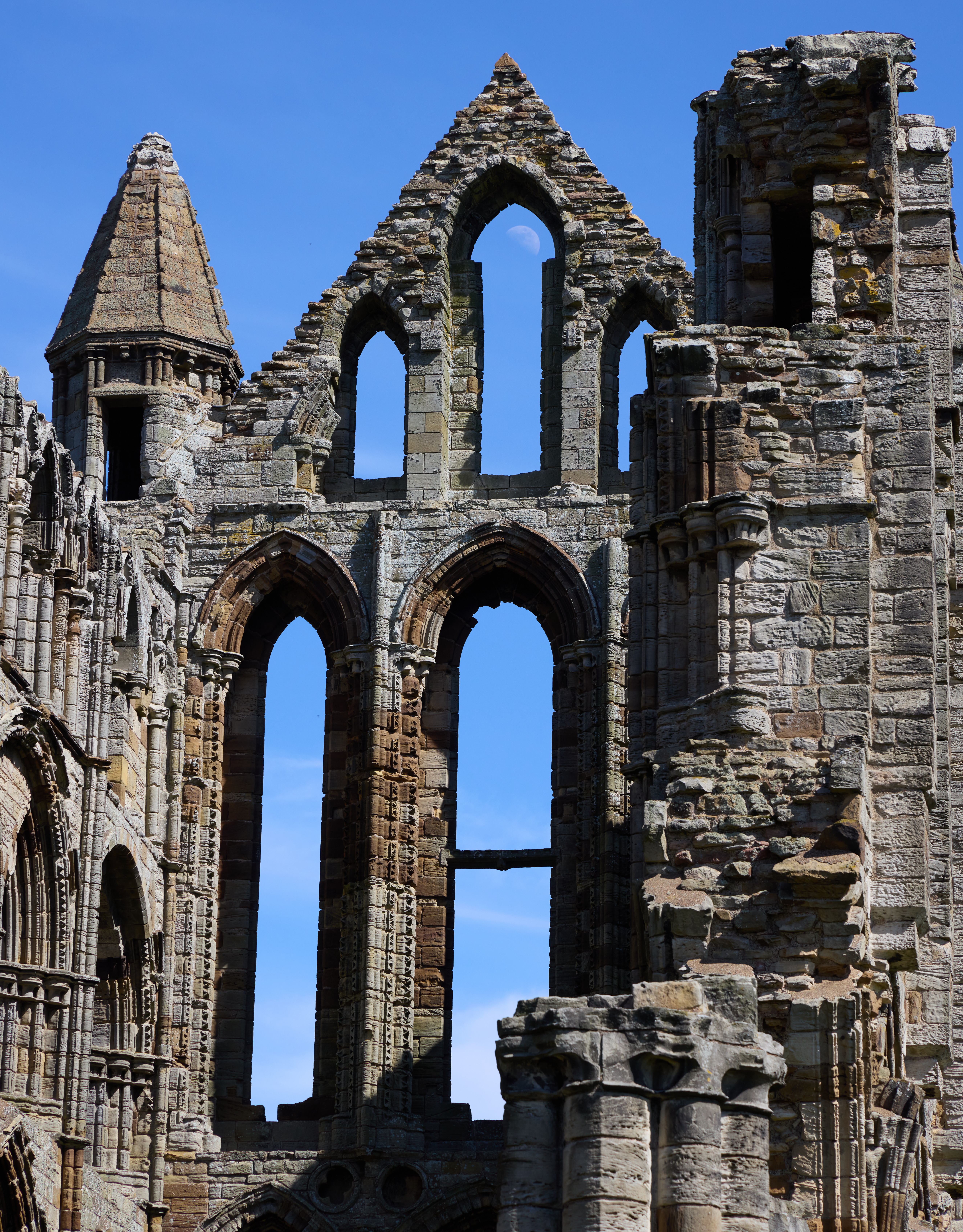 This architectural photograph captures the ruins of Whitby Abbey, a historic church located in Whitby, Yorkshire. Taken in the early afternoon during the spring season, the image shows the impressive stone structure of the abbey silhouetted against a bright blue sky. Prominently visible through the pointed arches and gothic windows is the moon, adding a distinctive element to the scene. Whitby Abbey is a well-known landmark in Yorkshire, and its ancient, weathered walls and intricate details are clearly showcased in this architectural shot. The photograph highlights both the cultural heritage of Whitby and the iconic church ruins that overlook the North Sea, reflecting the enduring beauty and significance of Whitby Abbey in Yorkshire.