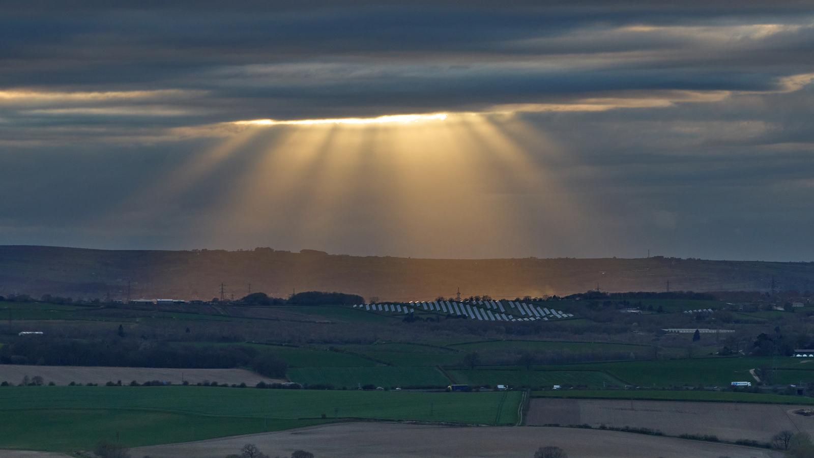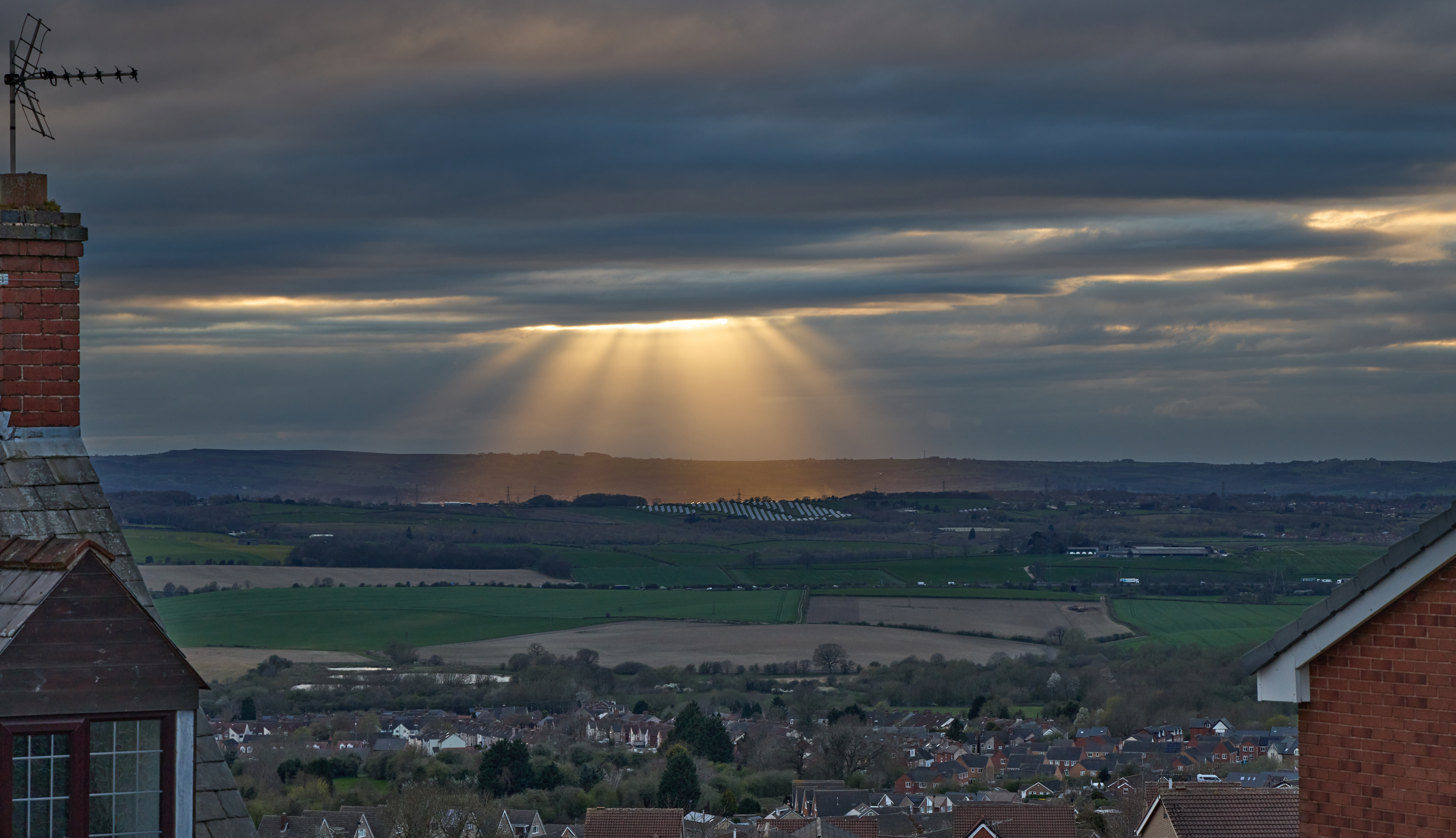 Gods rays on a cloudy spring evening over a solar farm as seen from houses