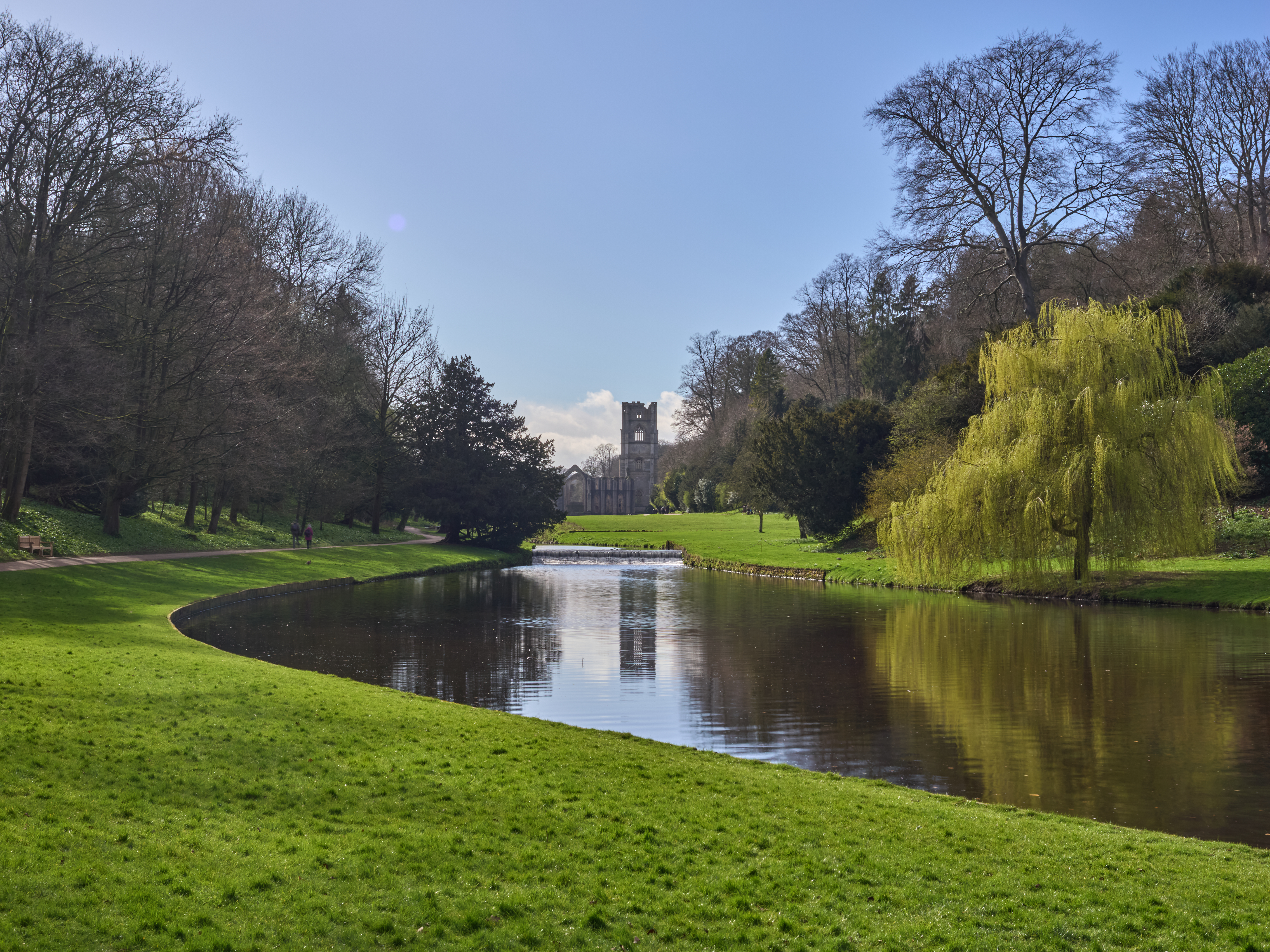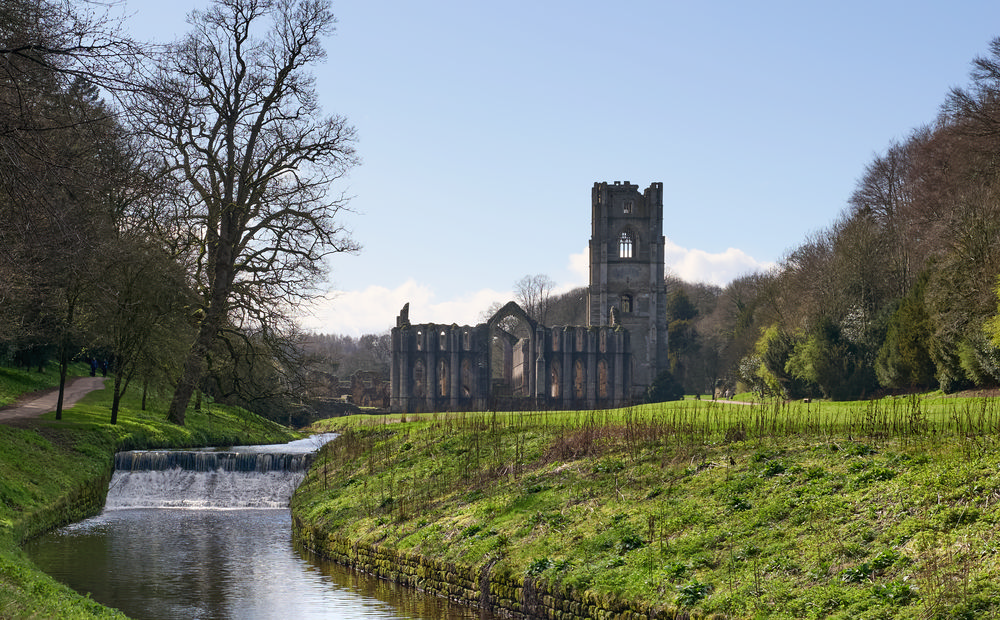 Looking towards Fountains abbey from the River Skell on a sunny spring day wide